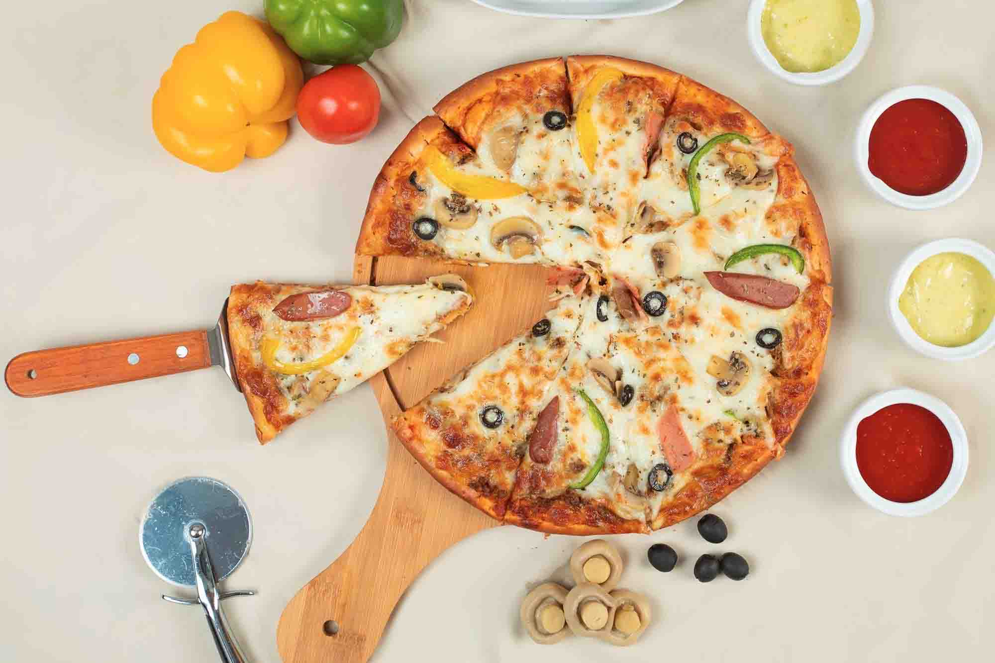 Available toppings: sausage, Italian sausage, hamburger, meatballs, salami, ham, chicken, pepperoni, bacon, anchovies, pepperoncinis, black olives, green olives, green peppers, mushrooms, fresh tomatoes...